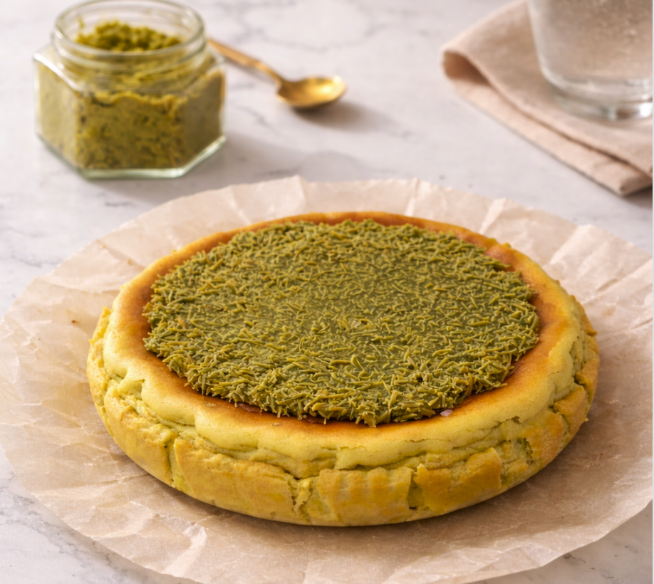我們的招牌開心果巴斯克,頂上鋪滿杜拜麵絲。巴斯克的焦香乳酪底,本來就跟開心果是絕配——這次直接把開心果做成麵絲壓上去,第一口是麵絲的酥脆,咬下去是巴斯克的綿滑,開心果的油脂香貫穿整口。三層層次,一口吃完。擺在蛋糕櫃裡,視覺就已經贏了。